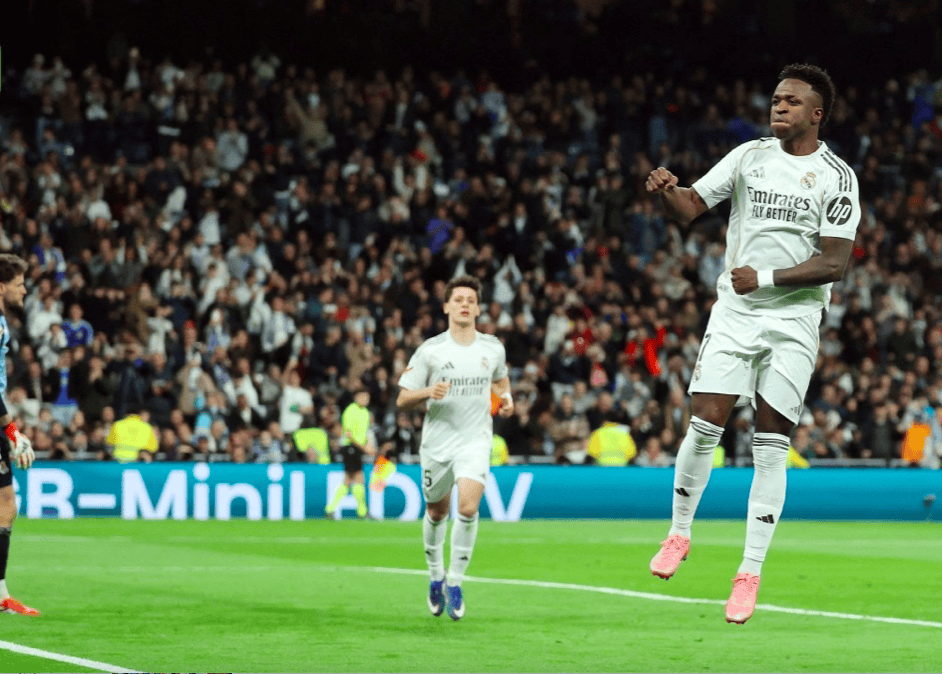 两分钟后,维尼修斯如法炮制,在禁区内被放倒,裁判同样判罚点球。维尼修斯亲自操刀,一蹴而就。